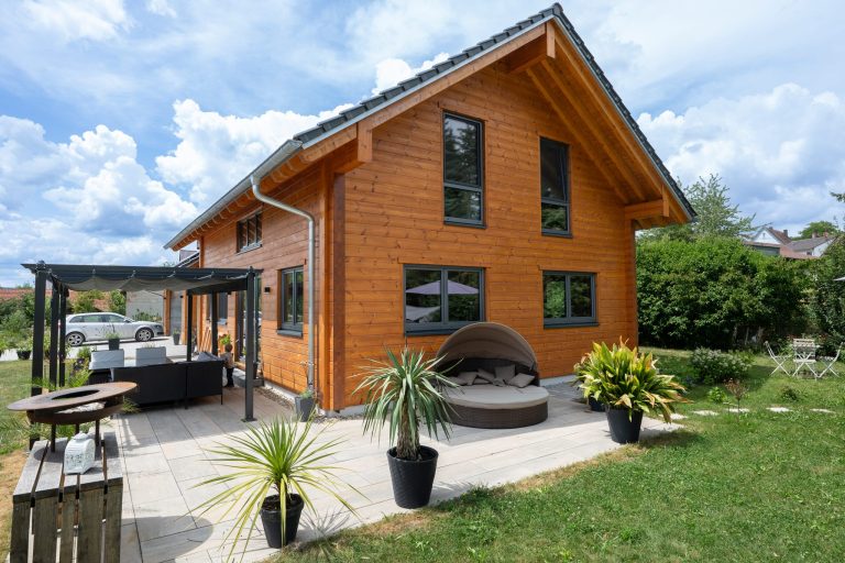 Wir haben verschiedene Blockhaus Anbieter verglichen und uns von Fullwood ein modernes, geradliniges Doppelhaus planen lassen.