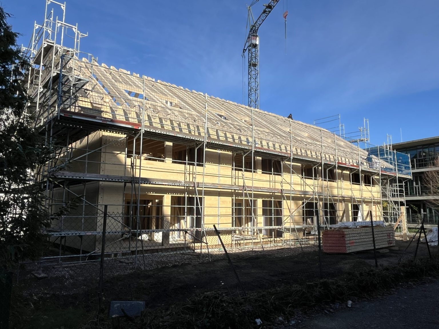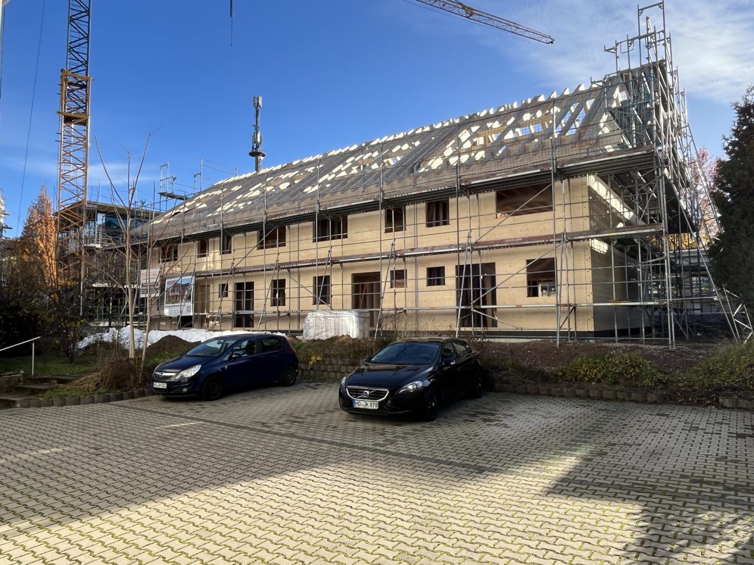 Umgesetzt wird ein Reihenhausprojekt mit 4 Wohneinheiten für einen professionellen Investor, der damit sein erstes Objekt in nachhaltiger Fullwood Bauweise realisiert. Die Schnelligkeit des Aufbaus binnen 2,5 Wochen bis zum gezeigten Baustand hat den Investor sehr beeindruckt. Er vergleicht das mit einer konventionellen Bauweise.