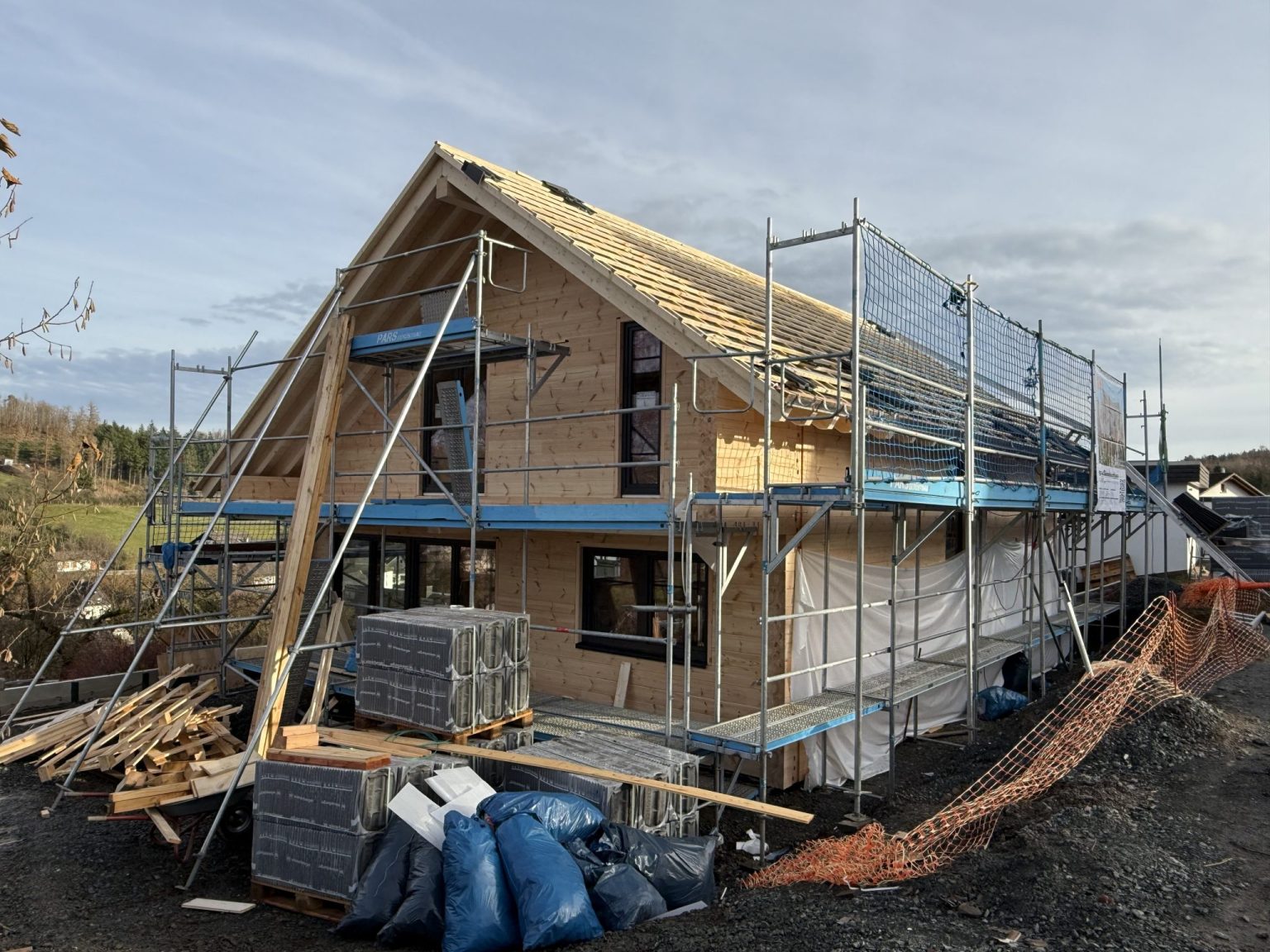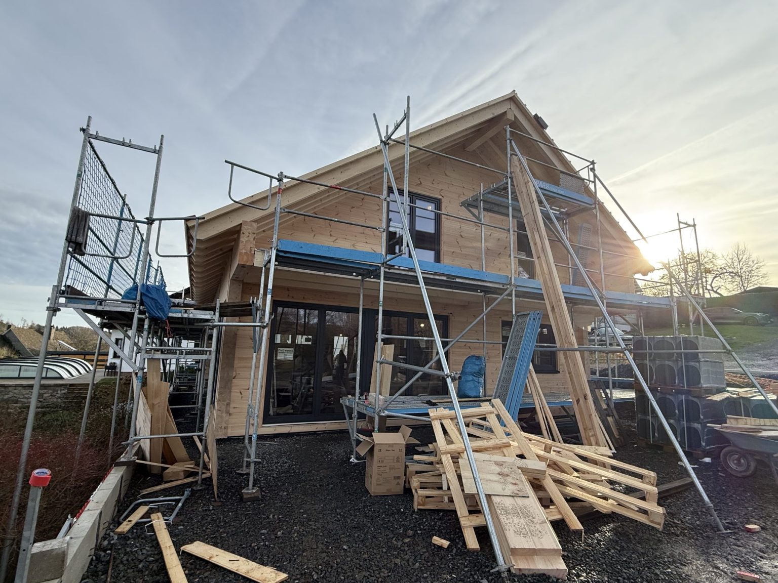 Die Bauherren haben sich für die Richtmeister-Montage vier Wochen Urlaub genommen und führen den kompletten Innenausbau selber durch, ein Nachbar bot sich spontan auch noch als Helfer an.