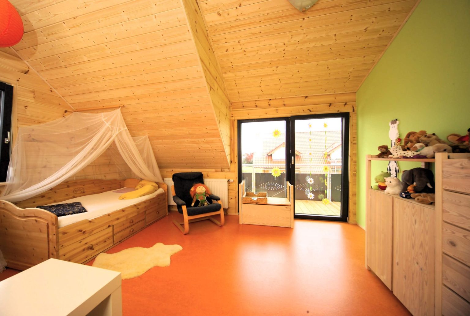 Eine gut begehbare, gegenläufige Podesttreppe führt vom Erdgeschoss zu einer kleinen Galerie unterm Dach. Letztere dient als kompakter Erschließungsflur, weshalb nur wenig Platz für Verkehrsflächen verloren geht. Dementsprechend stehen den Bewohnern auch auf dieser Ebene großzügig Räume zur Verfügung. Neben einem Wohnbad mit Eckbadewanne, Dusche und Doppelwaschbecken wurden noch drei weitere Räume eingeplant, wobei die Zimmer hinter der Dachgaube die absoluten Highlights sind. Mit vielen Fenstern und wenig Dachschräge bieten sie ihren Bewohnern ein helles, luftiges Ambiente mit Ausblick und zusätzlichem Freisitz auf dem Balkon.