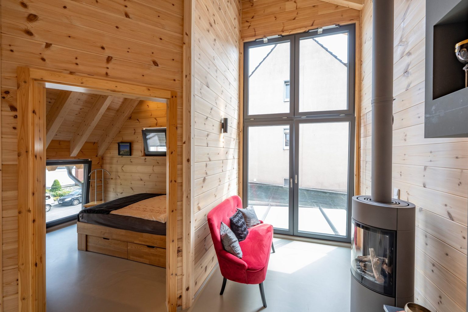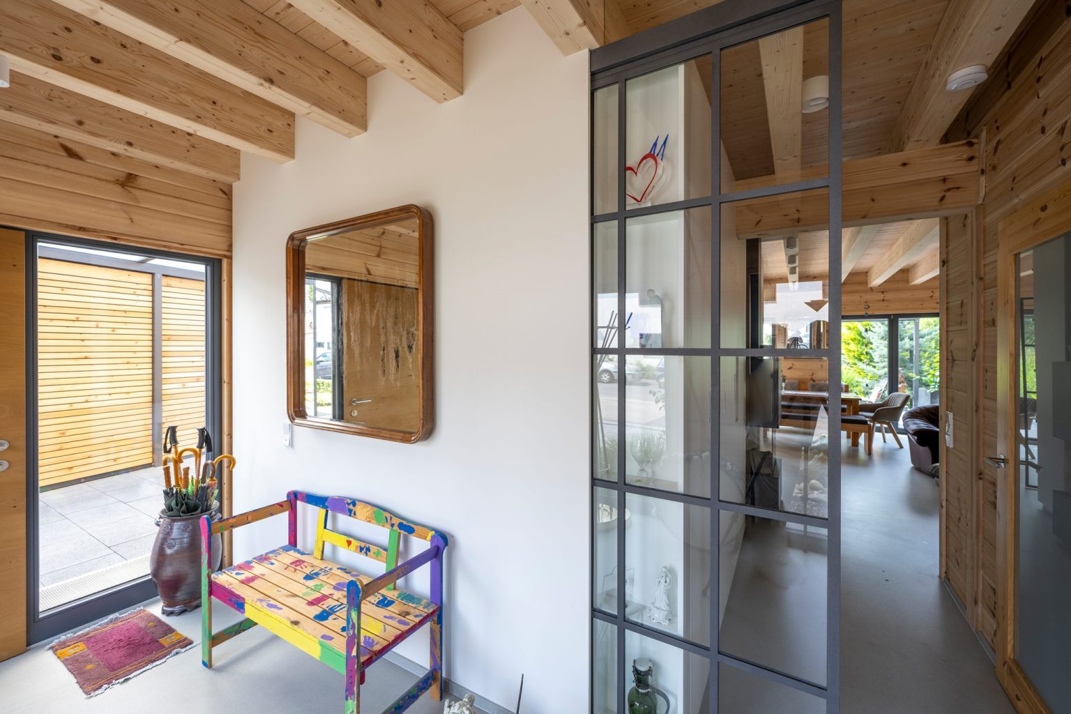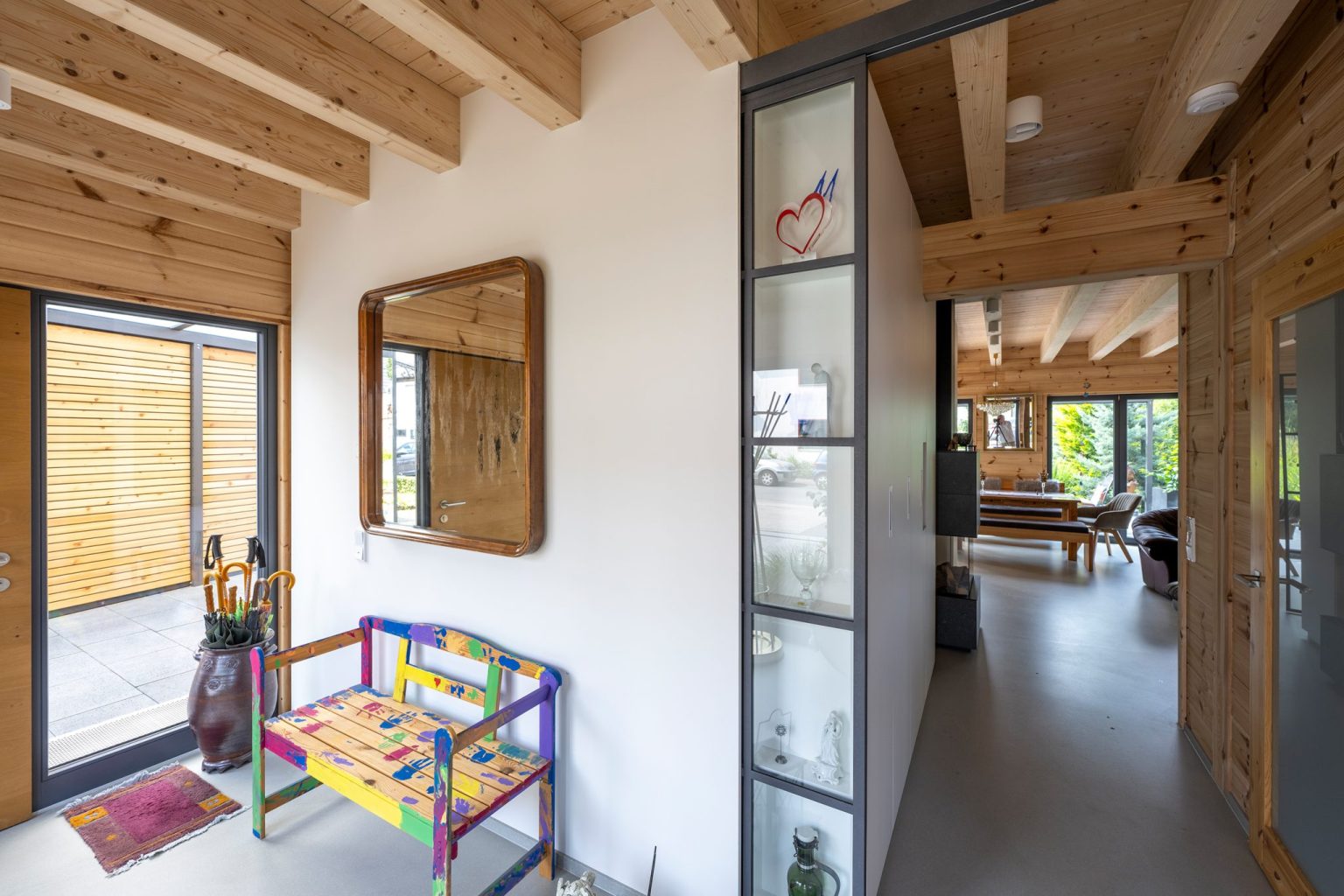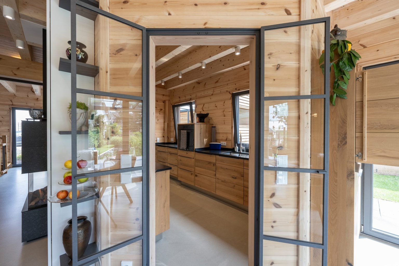 Holzhaus „Eikamp“ ist tagsüber dank großflächiger Fenster an den drei offenen Hausseiten lichtdurchflutet. Die Kiefernwände wurden mit UV-Schutzlasur am Nachdunkeln gehindert und bleiben dauerhaft naturhell. Einige Trennwände im Holzhaus wurden mit weiß gestrichenen Rigipsplatten verkleidet, was die Räume zusätzlich aufhellt und einen modernen Gesamteindruck hinterlässt. Während die weißen Wände das natürliche Licht reflektieren, erstrahlen die Massivholzwände und Balkendecken in ganzer Pracht – ganz ohne chemische Ausdünstungen! „Wegen der zur Straße vorgeschriebenen Dachhöhe entschieden wir uns für ein versetztes Pultdach. Zur Straße hin ist es höher und steiler als zur Gartenseite. Unser Obergeschoss besitzt eine enorme Lichte, da wir einen offenen Sichtdachstuhl wollten. Also entschieden wir uns zum Ausgleich im Erdgeschoss für eine Balkenlage mehr als üblich, sonst wäre der Luftraum im Dachgeschoss noch höher.“, erklärt Ute Müller-Geller. Während der Hausmontage kam dem Richtmeister die Idee, einen offenen Dachboden auf der höheren Hausseite einzuziehen. Der Bauherrschaft gefiel der Gedanke und heute befindet sich dort das eigene kleine Reich ihres Enkelsohnes, der über eine feste, stabile Metalleiter dort hinaufgelangt. Oben schütz ein fest installiertes Metallgeländer vor dem Absturz. Viele kreative Ideen, Besonderheiten und ökologische Materialien gibt es in Holzhaus „Eikamp“ zu entdecken. Beispielsweise wurde im ganzen Haus ein recycelbarer Fußboden aus Gießharz auf Rapsölbasis in einem hellen Grau verlegt, das hervorragend zu den anthrazitfarbenen Fenstern, Treppen- und Glastürelementen passt. So setzt sich das moderne, geradlinige Erscheinungsbild von außen konsequent nach drinnen fort. Eine Glas-Metall-Schiebetüre im Industrielook, die sich in der Wand zwischen Eingangsbereich und Wohnbereich versteckt, überrascht den Besucher, wenn sie hervorgezogen wird. Eine Flügeltüre im gleichen Design trennt die Küche vom Wohnbereich. Hier befindet sich auch eine als Schrank genutzte Durchreiche, die sowohl von der Küche als auch vom Esszimmer aus zu öffnen ist. „Von der Spülmaschine in der Küche kann ich das Geschirr dort einräumen und von der Esszimmerseite, wo sich außerdem ein Zugang zur Terrasse anschließt, das Geschirr zum Tischdecken entnehmen.“, freut sich die Hausherrin über ihre geniale Idee. Unsichtbar ist auch die Badezimmertüre im Obergeschoss, welche sich wie ein Chamäleon der Holzwandstruktur anpasst und lediglich durch eine Türklinke verraten wird. Neben der Transparenz, der Helligkeit und dem ökologischen Gedanken ist auch das Ressourcen-schonende Energiekonzept im Sinne der Hauseigentümer. Mittels Fußbodenheizung wird die von einer 12 Meter tiefen Grundwasserpumpe gespeiste Wärme im Holzhaus verbreitet. Sämtlichen Strom, u.a. auch für den Betrieb dieser Wasser-Wasser-Wärmepumpe, erzeugen zwei großflächige PV-Anlagen auf dem Hausdach solar. Eine E-Ladestation am Carport ist ebenfalls vorhanden. Abgesehen von dem Gasanschluss in der Küche ist Holzhaus „Eikamp“ energieautark. Zum Spaß haben sich Wolfgang und Ute zwei Gaskamine im Haus gegönnt. „Unsere einschaligen Blockwände dämmen sehr gut, sodass wir sehr sparsam heizen können. Die Wärmeschutzfenster und die gute Aufdachdämmung tragen zum geringen Heizenergieverbrauch bei.“, sagt er.