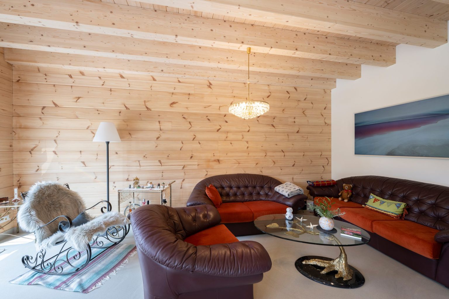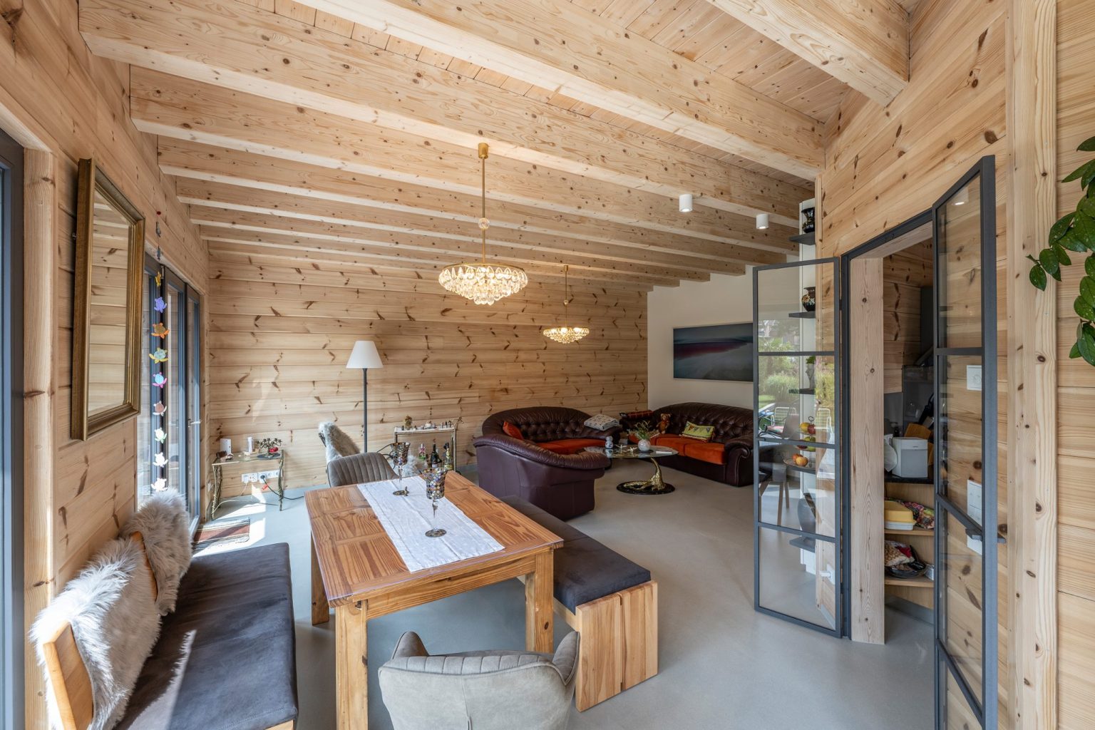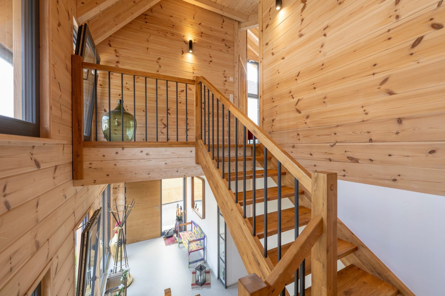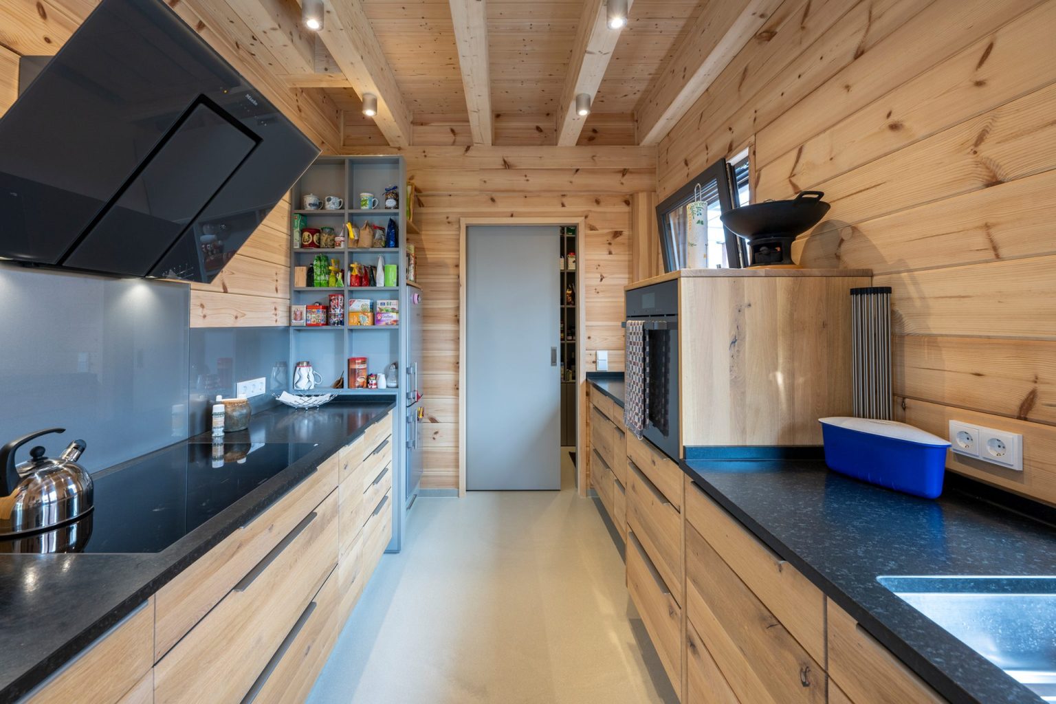 Holzhaus „Eikamp“ ist tagsüber dank großflächiger Fenster an den drei offenen Hausseiten lichtdurchflutet. Die Kiefernwände wurden mit UV-Schutzlasur am Nachdunkeln gehindert und bleiben dauerhaft naturhell. Einige Trennwände im Holzhaus wurden mit weiß gestrichenen Rigipsplatten verkleidet, was die Räume zusätzlich aufhellt und einen modernen Gesamteindruck hinterlässt. Während die weißen Wände das natürliche Licht reflektieren, erstrahlen die Massivholzwände und Balkendecken in ganzer Pracht – ganz ohne chemische Ausdünstungen! „Wegen der zur Straße vorgeschriebenen Dachhöhe entschieden wir uns für ein versetztes Pultdach. Zur Straße hin ist es höher und steiler als zur Gartenseite. Unser Obergeschoss besitzt eine enorme Lichte, da wir einen offenen Sichtdachstuhl wollten. Also entschieden wir uns zum Ausgleich im Erdgeschoss für eine Balkenlage mehr als üblich, sonst wäre der Luftraum im Dachgeschoss noch höher.“, erklärt Ute Müller-Geller. Während der Hausmontage kam dem Richtmeister die Idee, einen offenen Dachboden auf der höheren Hausseite einzuziehen. Der Bauherrschaft gefiel der Gedanke und heute befindet sich dort das eigene kleine Reich ihres Enkelsohnes, der über eine feste, stabile Metalleiter dort hinaufgelangt. Oben schütz ein fest installiertes Metallgeländer vor dem Absturz. Viele kreative Ideen, Besonderheiten und ökologische Materialien gibt es in Holzhaus „Eikamp“ zu entdecken. Beispielsweise wurde im ganzen Haus ein recycelbarer Fußboden aus Gießharz auf Rapsölbasis in einem hellen Grau verlegt, das hervorragend zu den anthrazitfarbenen Fenstern, Treppen- und Glastürelementen passt. So setzt sich das moderne, geradlinige Erscheinungsbild von außen konsequent nach drinnen fort. Eine Glas-Metall-Schiebetüre im Industrielook, die sich in der Wand zwischen Eingangsbereich und Wohnbereich versteckt, überrascht den Besucher, wenn sie hervorgezogen wird. Eine Flügeltüre im gleichen Design trennt die Küche vom Wohnbereich. Hier befindet sich auch eine als Schrank genutzte Durchreiche, die sowohl von der Küche als auch vom Esszimmer aus zu öffnen ist. „Von der Spülmaschine in der Küche kann ich das Geschirr dort einräumen und von der Esszimmerseite, wo sich außerdem ein Zugang zur Terrasse anschließt, das Geschirr zum Tischdecken entnehmen.“, freut sich die Hausherrin über ihre geniale Idee. Unsichtbar ist auch die Badezimmertüre im Obergeschoss, welche sich wie ein Chamäleon der Holzwandstruktur anpasst und lediglich durch eine Türklinke verraten wird. Neben der Transparenz, der Helligkeit und dem ökologischen Gedanken ist auch das Ressourcen-schonende Energiekonzept im Sinne der Hauseigentümer. Mittels Fußbodenheizung wird die von einer 12 Meter tiefen Grundwasserpumpe gespeiste Wärme im Holzhaus verbreitet. Sämtlichen Strom, u.a. auch für den Betrieb dieser Wasser-Wasser-Wärmepumpe, erzeugen zwei großflächige PV-Anlagen auf dem Hausdach solar. Eine E-Ladestation am Carport ist ebenfalls vorhanden. Abgesehen von dem Gasanschluss in der Küche ist Holzhaus „Eikamp“ energieautark. Zum Spaß haben sich Wolfgang und Ute zwei Gaskamine im Haus gegönnt. „Unsere einschaligen Blockwände dämmen sehr gut, sodass wir sehr sparsam heizen können. Die Wärmeschutzfenster und die gute Aufdachdämmung tragen zum geringen Heizenergieverbrauch bei.“, sagt er.