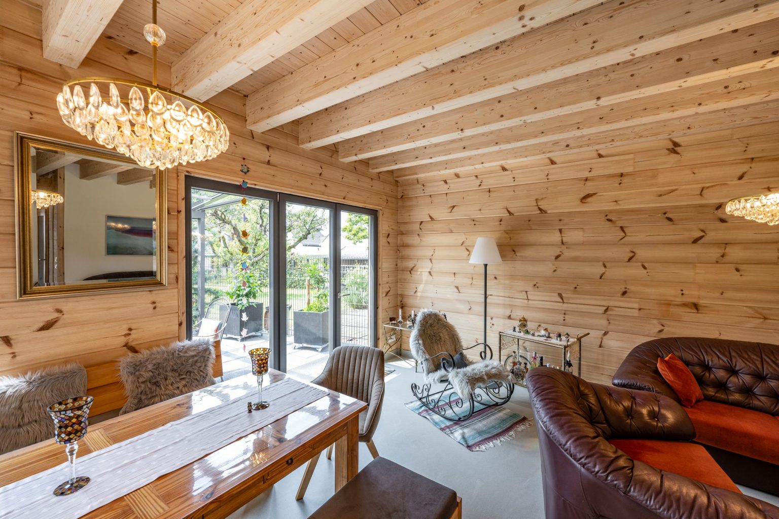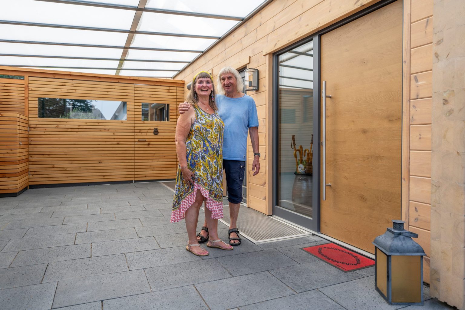 „Wir hatten dieses Grundstück, aber durften darauf nicht genau nach unseren Vorstellungen bauen. Vorgeschrieben war der direkte Anschluss ans Nachbargebäude in einheitlicher Linie zur Straße. Eigentlich wollten wir eher im hinteren Teil des Grundstücks bauen mit großem Vorgarten. Außerdem mussten wir das Haus höher bauen, als ursprünglich geplant. Zum Glück hat Fullwood Wohnblockhaus uns nicht auch noch Vorschriften gemacht und konnte alle unsere Wünsche sowie die Vorgaben des Bauamtes umsetzen. Wir durften sogar in der Bauphase noch spontane Ideen verwirklichen.“, sagt Wolfgang Geller und ist begeistert über die Flexibilität seines Hausherstellers. Er und seine Frau hatten Holzhaus „Eikamp“ zuerst selbst entworfen, dann mit Fullwood bis ins Detail geplant und zuletzt als Vollmontage bauen lassen. Im Anschluss übernahmen externe Handwerksfirmen den Ausbau. „Die Blockwände für unser Haus wurden im Werk passgenau vorgefertigt, dabei haben wir sogar zeitweise zugesehen. Im September erfolgte die Hausmontage auf den Keller und schon im April zogen wir in unser neues, komplett fertiges Zuhause ein!“, ergänzt die Hausherrin. Sogar der Carport und die gesamte Außenanlage inklusive Terrasse, weitläufigem Gartenparadies und Schwimmteich waren da schon fertig. Draußen ist alles ebenerdig und die Schwellen der Terrassentüren sind sehr niedrig, sodass diese bei Bedarf auch mit einem Rollator überwindbar sind. Die Zimmertüren sind breiter als üblich, damit auch ein Rollstuhl hindurchpasst und öffnen nach außen aufschlagend. Die Geschosstreppe ist ebenfalls besonders breit, nicht so steil und besitzt ein großes Podest, sodass der Einbau eines Treppenliftes im Bedarfsfall möglich ist. Die Tritte sind beleuchtet, um in der Dämmerung sicher steigen zu können. Notwendige Anschlüsse sind in allen Geschossen vorhanden, auch im Keller, sodass, bei Versetzen der Trennwand im Flur, bis zu drei Wohneinheiten verwirklicht werden könnten. „Besonders praktisch ist schon jetzt, dass vom regengeschützten Carport ein Nebeneingang in unseren Vorratsraum führt, welcher wiederum der Küche angeschlossen ist. So tragen wir Einkäufe auf kurzem Weg in die Speisekammer oder zum Kühlschrank.“, sagt der Hausherr. Zum Garten ist der Carport geschlossen, besitzt aber auch hier eine Tür. „Wir wussten ganz genau, was wir wollten und nicht wollten, sodass unser Holzhaus wirklich perfekt für unsere Bedürfnisse ist.“, betont er. Und das ohne Aufpreis für die individuelle Planung!